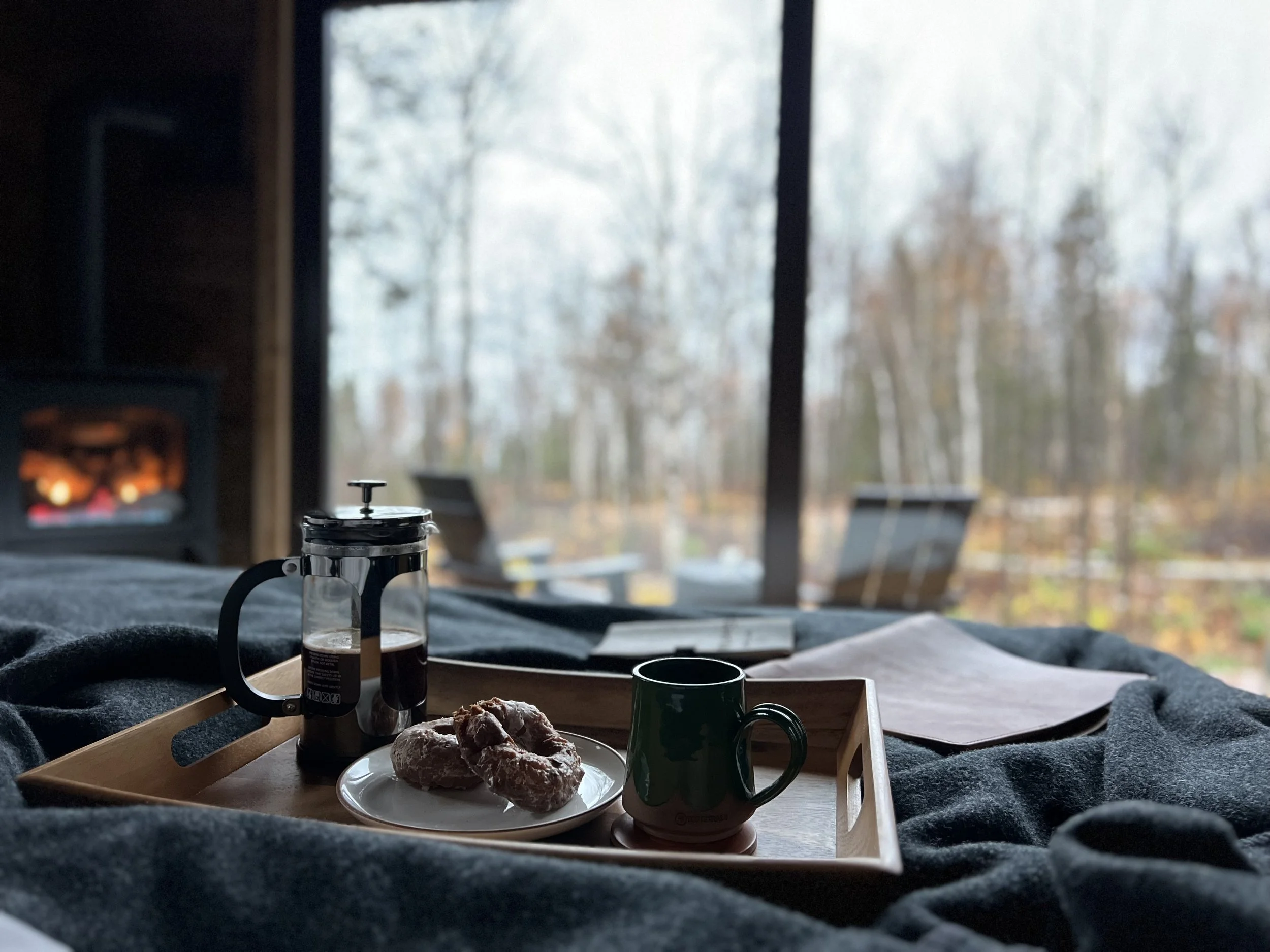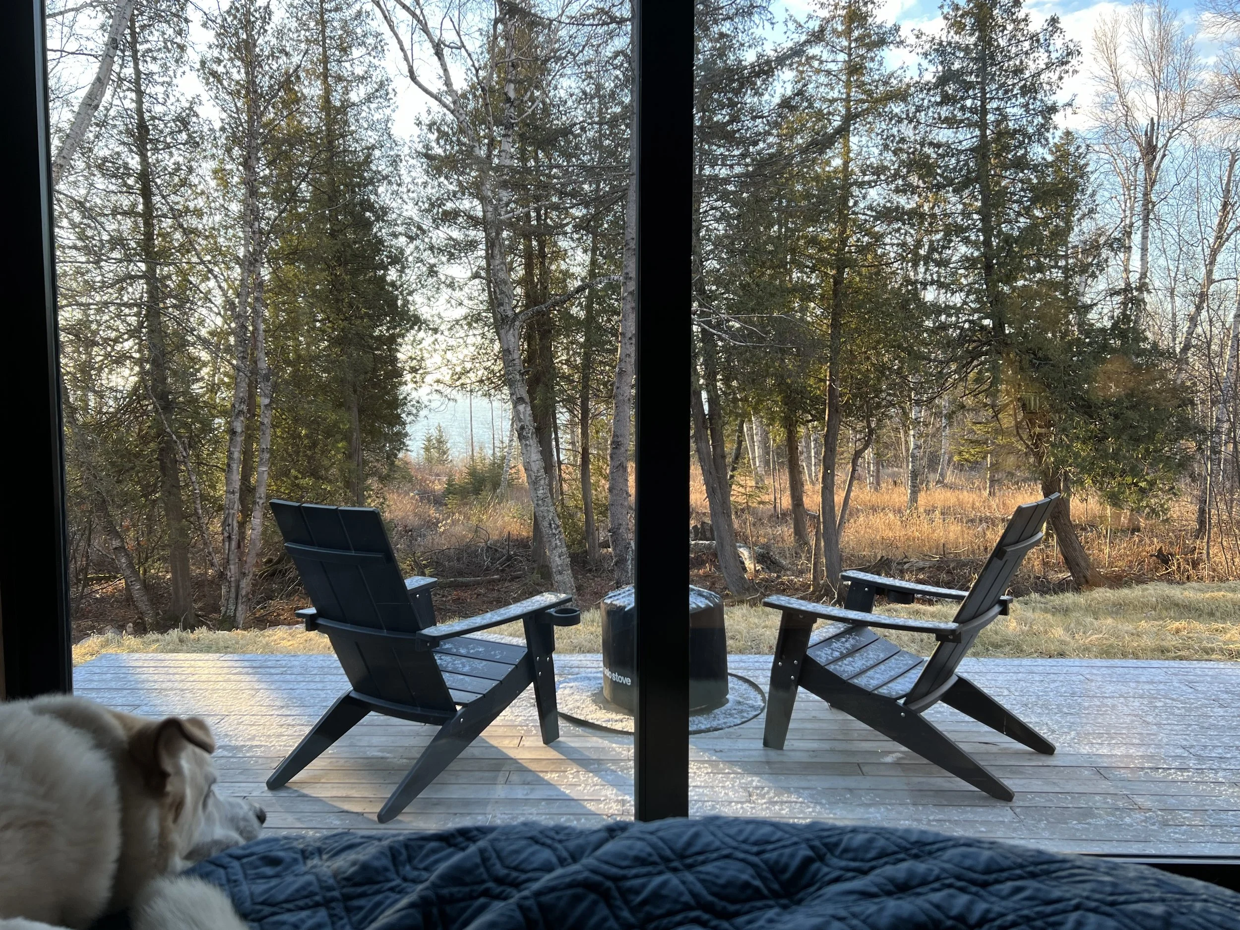 This photo was from our stay in Late November. Morning views after the curtain opens up revealing the 10ft sliding glass door views from your king bed at Tofte Trails. Shortly after this, 3 deer jumped the creek below while the waves on Lake Superior crashed in the distance. Step outside with the dusting of snow beneath your feet and a hot cup of Fika Coffee in hand.